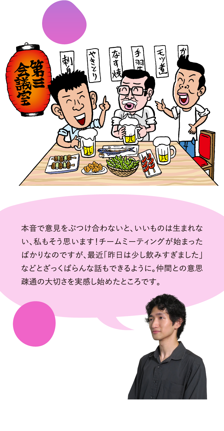 今、思い出しても、すごく楽しかった。入社後の配属は化成品開発部で、住宅のユニットバス関連の化粧材やベンチ材などの合成木材を開発するのが主な仕事だったのですが、そこには強烈な先輩方がいました。皆、毎日がむしゃらに仕事をして、終業後は「よしっ、第3会議室へ移動!」。居酒屋のことです(笑)。そこで愚痴は出ない。前向きな、夢のある開発談義をひたすらする。こんな新しい原料がある、じゃあ、すぐに取り寄せよう!試してみよう!という具合。その会議では先輩と同じ立場でアイデアを出すことも求められます。間もなく、その先輩からは、重要な新製品の設計から納品までのすべてを「任せたぞ!頼む!」と。新人の自分一人で上手くいくはずもなく、社外・社内の人に訊くしかない。何度もやり直しながら、懸命に取り組み、なんとかやり終えました。この頃の前向きに語り合い、聞き、それを行動と成果につなげられた、ということが私の原点になっています。