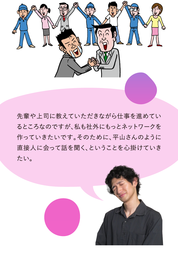群馬工場に在籍時、簡単には対処できないクレームが発生。連日の対応が必要になり、大きなコストもかかることに…大ピンチです。そんな状況なのに、お客様の中にも助けてくださる方がいました。建設的な助言や状況分析をいただいたり…。ご迷惑をかけているのに、逆に救われる。この危機を乗り越えられた大きな要因です。クラボウの先人たちが築いたお客様との信頼関係のたまものです。困った時には、一人で抱え込みがちだけど、上司や先輩、社外の方に相談できる人がいる。そうしたつながりは財産になります。問題が発生しても成長できるし、新しいことを生み出せる原動力にもなると思います。