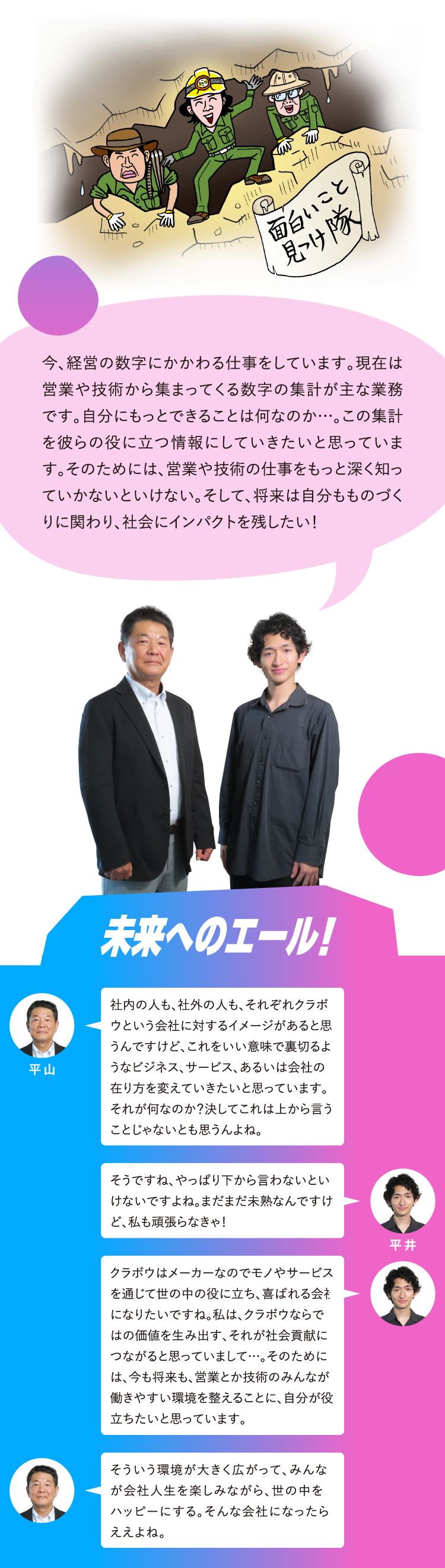 こんな原料がある、あんな技術がある、それらを組み合わせたらどうなるか?いつも新しいモノやコトを生み出せないか、と思っています。当社の住宅建材用原料のノウハウを活かして全く畑違いの3Dプリンターに挑戦したことも。試行錯誤したけど実用化には至らなかった。でも別の商品アイデアとして生きています。自分でとことん没頭して、突き詰めて、人とコミュニケーションすれば、新しい発想も生まれるし、仕事も絶対面白くなると思います。この面白さを皆にも感じてもらいたい。なんなら「私が面白くしたるっ!(笑)」。昔は、人のために役立ちたい、と漠然と夢想していましたが、今は、新しいビジネスモデルを作って、会社のチームみんなで面白いことを見つけたい、それで世の中を楽しくしたい!まだまだ、これからです。
